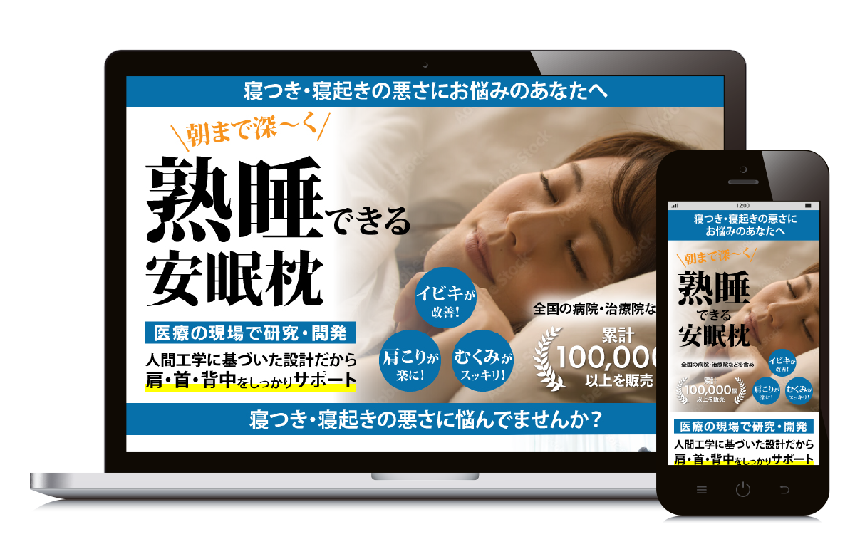 快眠をサポートする安眠枕のLPを制作。心地よさと信頼感が伝わるやさしいトーンで設計し、使用イメージや口コミを交えて睡眠の悩みに寄り添う構成に。購入までスムーズにつながる導線を意識しました。